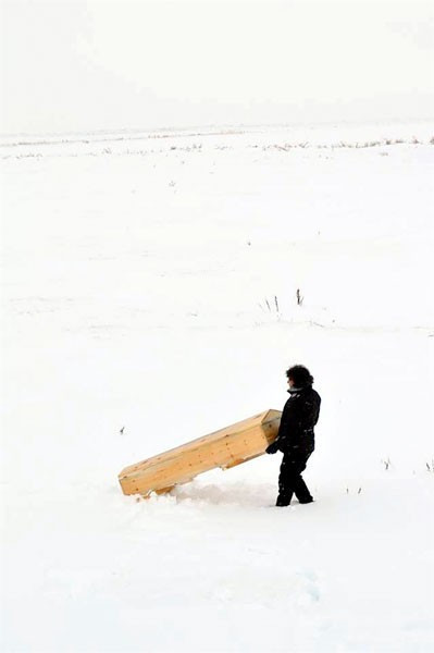 Galerinin tamamı için tıklayınızProf.Dr. Mehmet Kavukçu, karla kaplı Erzurum ovasında boş bir tabutu sırtladı, bir süre taşıdıktan sonra içerisine girdi ve kapağını kapattı. İnsana en büyük acıları yaşatan, belki de ölümün en sert yüzü ile karşılaşılan terör ve şiddetin, dünyayı kasıp kavurduğuna işaret eden Prof. Dr. Kavukçu, her an yaşanılabilecek olan ölümden korkulmayacağı anlayışını da betimledi.
