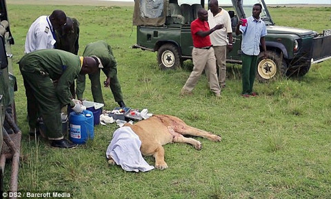 11 yaşındaki dişi aslan erkek bir mandanın saldırısına uğrayınca ölümden döndü. Fotoğraf galerimizde kanlı ve sizi rahatsız edebilecek görseller olabilir dikkat! Kenya'da 12 yaşındaki dişi bir aslan mandanın boynuzlu saldırısına uğradı.. Arka bacak kısmı boydan boya yarılan Anne Aslan için acilen müdahele gerekiyordu Acı içinde inleyen anne aslan için veteriner ekibi olay yerine geldi.. Bayıltılan aslana veterinerler müdahele etti. Doğal ortama elden geldiğince müdahele etmeyen veteriner ekibi ölmeyen ama acı çeken hayvanları tedavi edebiliyor. Anne aslana yapılan operasyon yaklaşık 1,5 saat sürdü Yarayı temizleyen ve dikiş atan veterinerler daha sonra Özel antiseptik bir macunla yarayı kaplayıp aslanın uyanmasını beklediler Aslanın uyanmasını bekleyip sağlığını kontrol eden ekip aslanın doğal ortamına dönmesini sağladılar Yavrularının yanına dönen aslan şimdi iyi durumda aldığı ölümcül darbenin ise sadece izleri kaldı...