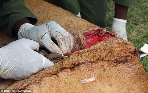 11 yaşındaki dişi aslan erkek bir mandanın saldırısına uğrayınca ölümden döndü. Fotoğraf galerimizde kanlı ve sizi rahatsız edebilecek görseller olabilir dikkat! Kenya'da 12 yaşındaki dişi bir aslan mandanın boynuzlu saldırısına uğradı.. Arka bacak kısmı boydan boya yarılan Anne Aslan için acilen müdahele gerekiyordu Acı içinde inleyen anne aslan için veteriner ekibi olay yerine geldi.. Bayıltılan aslana veterinerler müdahele etti. Doğal ortama elden geldiğince müdahele etmeyen veteriner ekibi ölmeyen ama acı çeken hayvanları tedavi edebiliyor. Anne aslana yapılan operasyon yaklaşık 1,5 saat sürdü Yarayı temizleyen ve dikiş atan veterinerler daha sonra Özel antiseptik bir macunla yarayı kaplayıp aslanın uyanmasını beklediler Aslanın uyanmasını bekleyip sağlığını kontrol eden ekip aslanın doğal ortamına dönmesini sağladılar Yavrularının yanına dönen aslan şimdi iyi durumda aldığı ölümcül darbenin ise sadece izleri kaldı...