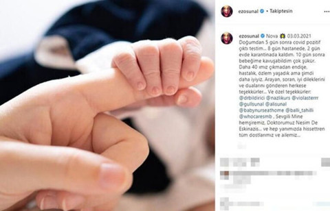Galerinin tamamı için tıklayınız"Nova, 03.03.2021. Doğumdan beş gün sonra Covid pozitif çıktı testim. Sekiz gün hastanede, iki gün evde karantinada kaldım. 10 gün sonra bebeğime kavuşabildim çok şükür. Daha 40'ımız çıkmadan endişe, hastalık, özlem yaşadık ama şimdi daha iyiyiz. Arayan, soran, iyi dileklerini ve dualarını gönderen herkese teşekkürler. Hep yanımızda hissettiren tüm dostlarımız ve ailemize özel teşekkürler."
