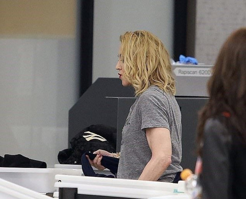 Madonna, havaalanı güvenliğine geldiğindeyse tişörtle kalacak şekilde üzerindekileri çıkardı.