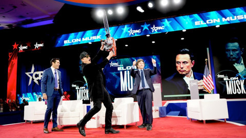Konferansa katılan Arjantin Devlet Başkanı Milei tarafından kendisine hediye edilen altından yapılmış büyük bir elektrikli testere ile sahnede poz veren Musk, "Bu testere bürokrasi için" diye bağırdı.
