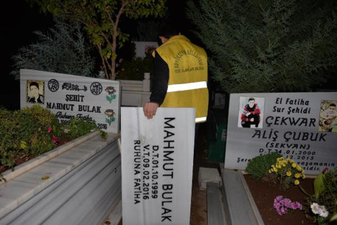 Galerinin tamamı için tıklayınızDiyarbakır Emniyet Müdürlüğü tarafından Büyükşehir Belediyesi’ne gönderilen uyarı yazısı üzerine Yeniköy Asri Mezarlığı’nda bulunan PKK-PYD'li teröristlere ait üzer,lerinde 'şehit' ifadesinin yanı sıra örgütü simgeleyen slogan ve flamaların bulunduğu mezar taşları değiştirildi.