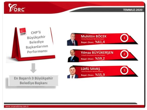 ORC Araştırma Şirketi'nin Yerel Yönetimler Performans Araştırma anketi sonuçlandı. Ankette CHP'li başkanlar arasında en başarılı belediye sonuçlarına yer verildi. İlk sırada sürpriz isim En başarılı CHP'li belediye başkanları araştırmasında ilk sırada sürptriz bir isim Antalya Büyükşehir Belediye Başkanı Muhittin Böcek yer aldı. Ankette Ekrem İmamoğlu ve Mansur Yavaş ilk 3'te kendine yer bulamadı. Son iki aylık performans Belediye Başkanlarının kendi seçmen grubunda değerlendirildiği araştırmada katılımcılara "Son 2 ayı değerlendirdiğinizde şehrinizin büyükşehir belediye başkanı'nı başarılı buluyor musunuz?" sorusu yöneltildi.Sürpriz isim zirvede Çıkan sonuçlara göre Antalya Büyükşehir Belediye Başkanı Muhittin Böcek yüzde 61,4 oranıyla ile birinci sırada yer aldı. Eskişehir'in sevilen başkanı Başkan Böcek'i yüzde 59.2 oranı ile Eskişehir Büyükşehir Belediye Başkanı Yılmaz Büyükerşen izledi. Başkan Büyükerşen'i ise yüzde 55,9 oranı ile Hatay Büyükşehir Belediye Başkanı Lütfü Savaş takip etti. İlk 3'te İstanbul Büyükşehir Belediye Başkanı Ekrem İmamoğlu ve Ankara Büyükşehir Belediye Başkanı Mansur Yavaş'ın olmaması dikkat çekti.İşte ORC'nin yapmış olduğu araştırmadan çıkan sonuç: