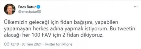Batur Twitter hesabından bir paylaşım yaparak, "Ülkemizin geleceği için fidan bağışını, yapabilen yapamayan herkes adına yapmak istiyorum. Bu tweetin alacağı her 100 FAV için 2 fidan dikiyoruz" dedi.