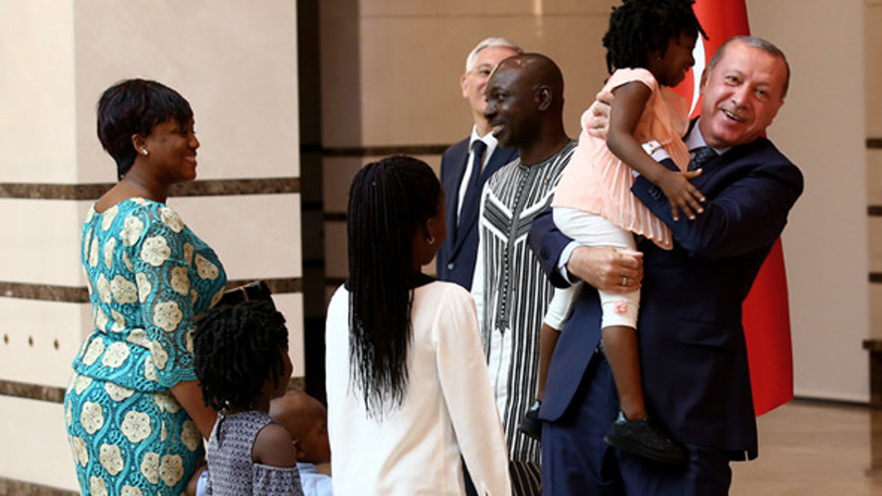 Türkiye Başkanı Recep Tayyip Erdoğan, Burkina Faso Büyükelçisi Brahima Sere’yi kabul etti.Cumhurbaşkanlığı Külliyesi'nde gerçekleşen kabulde, Büyükelçi Sere, Başkan Erdoğan'a güven mektubu sundu. Erdoğan, Sere'nin eşi Fanta Traore, çocukları Yasmine Aquela (11), Kenza Aliah (6), Bassari Nadia (4), Ramzy S Nasser (2) ile yakından ilgilendi. Çocukları sevdiği bilinen Erdoğan, Burkina Faso Büyükelçisi'nin çocuklarıyla iyi anlaştı.Onlara kucak açan Başkan Erdoğan, çocuklardan birini de kucağına alıp sevdi. Başkan Erdoğan, kabul sırasında Büyükelçi Sere'nin çocuklarıyla yakından ilgilendi. 2 yaşındaki Ramzy S. Nasser'in elini öperek kucağına alan Erdoğan, 4 yaşındaki Bassari Nadia'nın da isteğini geri çevirmedi. Cumhurbaşkanlığı Külliyesi'ndeki o eğlenceli anlar objektiflere işte böyle yansıdı.