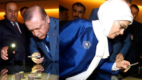 Cumhurbaşkanı Erdoğan ve eşi Emine Erdoğan, Bahreyn'den ayrılmadan önce Kur'an Müzesini ziyaret etti. Erdoğan çifti özellikle mini Kuran ve objelere ilgi gösterdi. Cumhurbaşkanı Erdoğan, resmi ziyaret kapsamında geldiği Bahreyn'de Başbakan Khalifa bin Salman Al Halife tarafından onuruna verilen öğle yemeğinin ardından Bahreyn El-Fetih Camisi ile Kuran Müzesine geçti. Basına kapalı gerçekleşen ziyaretlerde Erdoğan, incelemelerde bulundu ve yetkililerden bilgi aldı. Cumhurbaşkanlığı sitesinden yapılan açıklamada "Ziyaret esnasında Cumhurbaşkanı Erdoğan müzede sergilenen, farklı tarihî dönemlere ait, farklı yazı çeşitleri ile yazılmış Kur'an-ı Kerim örneklerini inceledi ve eserlerle ilgili yetkililerden bilgi aldı" denildi. EMİNE ERDOĞAN İLGİTLE İNCELEDİ Müze ziyaretinden geçilen fotoğraflarda ise, Emine Erdoğan'ın özellikle minyatür Kuran baskılarına ve tabletlerine olan ilgisi dikkat çekti. ERDOĞAN VE HEYET SUUDİ ARABİSTAN'A GEÇTİ Cumhurbaşkanı Recep Tayyip Erdoğan, Bahreyn'deki temaslarının ardından özel uçak "TUR" ile saat 19.00'da Suudi Arabistan'ın başkenti Riyad'a gitti.