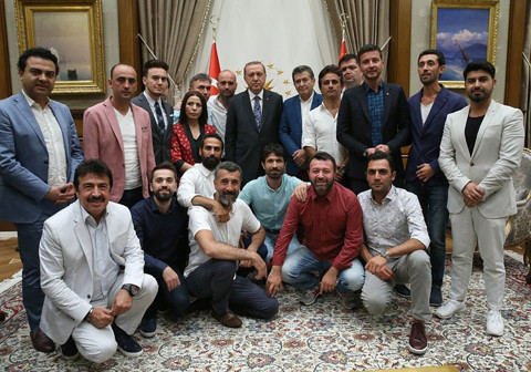Cumhurbaşkanı Recep Tayyip Erdoğan, Beştepe Millet Camisi önünde vatandaşlarla bir araya gelen sanatçı, oyuncu, radyocu ve sporcuları Cumhurbaşkanlığı Külliyesi'nde kabul etti. Cengiz Kurtoğlu, Mustafa Ceceli, Alişan, Doğuş, Kutsi, Nihat Doğan, Linet, Berdan Mardini, Davut Güloğlu, İntizar, Serkan Kaya, Ümit Sayın, Ahmet Selçuk İlkan, Ece Erken, Saruhan Hünel, Erdem Kınay, Yaşar İpek, Uğur Arslan, Sinan Akçıl, Ersin Düzen, Vatan Şaşmaz, Sefa Doğanay, Polat Yağcı, Hopdedik Ayhan, Afrikalı Ali, Gezegen Mehmet, Adem Metan, Güvenç Kurtar, Tanju Çolak, İsmail Özkan, Melih Kurtuluş, Survivor Nagihan gibi ünlülerin bulunduğu kabulde, misafirler Cumhurbaşkanı Erdoğan'a desteklerini ifade etti. Erdoğan da desteklerinden dolayı sanatçı, oyuncu, radyocu ve sporculara teşekkürlerini iletti. Kabulde, İçişleri Bakanı Efkan Ala, Avrupa Birliği (AB) Bakanı Ömer Çelik, Enerji ve Tabii Kaynaklar Bakanı Berat Albayrak hazır bulundu.
