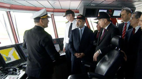 Başbakan Recep Tayyip Erdoğan, hizmete alınan ‘Barbaros Hayrettin Paşa' isimli sismik araştırma gemisini gezdikten sonra kısa bir süreliğine kaptanlardan dümeni devraldı.