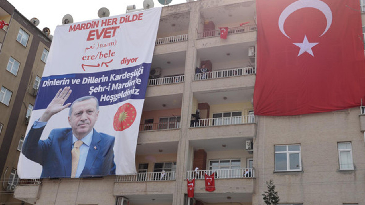 Erdoğan, Mardin'de 4 dilde pankartla karşılandı CUMHURBAŞKANI Recep Tayyip Erdoğan, toplu açılış töreni ve miting Mardin'e geldi. Erdoğan için kentte Türkçe, Kürtçe, Arapça ve Süryanice 'Hoş geldiniz' ve 'Mardin her dilde evet' yazılı pankart asıldı. Cumhurbaşkanı Erdoğan'ın gelişi öncesi Mardin'de güvenlik kuvvetleri teyakkuza geçti. Erdoğan'ın geçiş güzergahları tamamen trafiğe kapatılırken, vatandaşlar arama noktasında aramadan geçirildi. Yüksek binalara keskin nişancı özel harekat timleri yerleştirirken, güvenlik önlemleri kapsamında çöp konteynerleri kaldırıldı. Kentin çeşitli noktalarına ve açılışın yapılacağı alana Türkçe, Kürtçe, Arapça ve Süryanice 'Hoş geldiniz' ve 'Mardin her dilde evet' yazılı pankart asıldı. Karşılama protokolünde Mardin Müftüsü İsmail Çiçek ile Diyarbakır-Mardin Süryani Metropoliti Saliba Özmen de yer aldı ve ikisi uzun süre sohbet etti. Protokolde şehit aileleri ve gaziler için özel yer ayrılırken, miting alanı polis ekipleri tarafından eğitimli köpeklerle birkaç kez arandı. Miting alanının bazı yerlerine sinyal kesici jammer yerleştirildi.