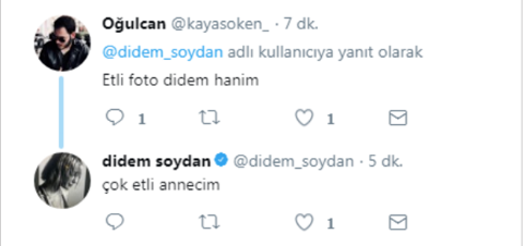 Galerinin tamamı için tıklayınızBikinili paylaşımlarıyla sosyal medya hesabını takip eden erkek hayranlarını şaşırtmayı başaran Didem Soydan adından söz ettirmeye devam ediyor. Didem Soydan bu defa da mutfakta çekildiği seksi fotoğrafını sosyal medya hesabı Twitter'dan paylaştı. Paylaşımına çok sayıda yorum geldi. Takipçisinin 'Of be erik gibisiniz Didem Hanım' yorumuna Didem Soydan 'Aman Ezgi Hanım o sizin erikliğiniz' şeklinde cevap verdi. Bir takipçisi de 'Etli foto Didem Hanım' şeklinde yorum yaparken Soydan da hayranına 'Çok etli annecim' şeklinde cevap vermeyi ihmal etmedi.