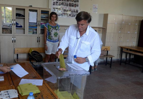 Galerinin tamamı için tıklayınızAynı okulda oy kullanmaya gelen tek ayağı olmayan bir kişi,