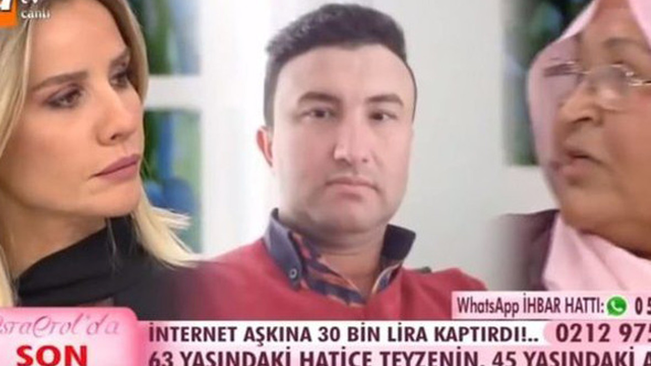 Esra Erol'da şoke eden olay! 63 yaşındaki Hatice Kılıç 45 yaşındaki adama aşık oldu Galerinin tamamı için tıklayınız ATV'de ekrana gelen Esra Erol'un programında Hatice Kılıç'ın aşk hikayesi damga vurdu. 45 Yaşındaki adama aşık olan Hatice Kılıç hem gönlünü hemde parasını kaptırarak ekran başındakileri şoke etti.