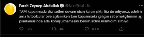 Galerinin tamamı için tıklayınızÜnlü oyuncu yaptığı paylaşımda "Tam kapanmada dizi setleri devam etsin kararı çıktı. Biz de ediyoruz, edelim ama futbolcular bile aşılanırken tam kapanmada çalışan set emekçilerinin aşı planlamasında asla konuşulmamasını benim aklım mantığım almıyor" ifadelerini kullandı.