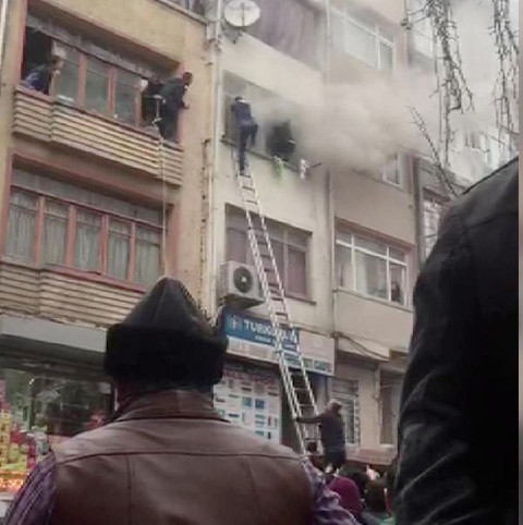 Olay Fatih Mimar Hayrettin Mahallesi Balipaşa Yokuşu'nda salı günü saat 17.30 sıralarında meydana geldi. 3 katlı apartmanın 2'inci katında henüz bilinmeyen bir nedenle yangın çıktı. Yoğun duman nedeniyle evde yaşayan Suriyeli 2 kişi mahsur kaldı. Pencereye çıkan Suriyeliler kurtarılmayı bekledi. Yangını görenler itfaiye ve sağlık ekiplerine haber verdi. Bu sırada camlarda bekleyen Suriyeli işçilerin yardımına esnaf ve vatandaşlar koştu. İşçiler pencereden atlamak üzereyken, 2. kata kadar uzayan merdiven ve ip yardımıyla Suriyeli işçiler, esnaf tarafından kurtarıldı. Yangından kurtarılanlara ilk müdahale olay yerine gelen ambulansta yapıldı. Yangın itfaiyenin çalışmasıyla söndürülürken kurtarılan 2 kişinin sağlık durumunun iyi olduğu öğrenildi "DUMANDAN BOĞULMAK VE DÜŞMEK ÜZERELERDİ" Mahsur kalan 2 kişiye merdivenle müdahale eden esnaf Kadir Uçar, "Çocuklar camdan çıktı. Düşmek üzereydi. Bizde reklam işiyle uğraştığımızdan dolayı merdivenimiz var. Bu merdiveni alıp bir an önce koştuk ve insanları kurtardık. Şükürler olsun yani. Allah'ımız bu işe nasip etti ve kurtardık. İtfaiye gelmeden biz bu insanları biz bu insanları indirebildik, şükürler olsun. Dumandan boğulmak ve düşmek üzerelerdi. Şükürler olsun hemen gidip alabildik onları" dedi. "YANAN KİŞİNİN CAN OLDUĞUNU HİSSEDİNCE HEMEN MÜDAHALE ETTİK" Mahalle sakini Nuri Kırbaş, "Öncelikle küçük bir yangın olarak gözüktü. Esnaf yangın söndürme tüpüyle müdahale etmeye çalıştı. Sonradan yangın büyüyünce, müdahale yetersiz kalınca itfaiye arandı. Sonra itfaiye gelinceye kadar ki süreçte esnaf kendi merdivenleriyle, ipiyle kendi canıyla mücadele ettiler. Esnaf olarak sonuçta yanacak olan kişiler candı. Yabancı olması yada yerli olması herhangi bir şey ifade etmiyor. Yanan kişinin can olduğunu hissedince biz hemen müdahalede bulunduk. Kimisi merdivenle, kimisi iplerle müdahalede bulununca elimizden geleni yapmaya çalıştık" dedi.