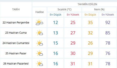 Meteoroloji Genel Müdürlüğü, Ramazan Bayramı için beklenen hava durumu raporunu açıkladı. Yaklaşık bir aydır etkili olan serin ve yağışlı hava artık yurdu terk ediyor. Hava sıcaklıkları ise hissedilir derecede artıyor. İstanbul, Şanlıurfa, Antalya, İzmir hava durumu raporları ne diyor? Bayram havası için müthiş haber. Sıcaklıklar bir anda artacak. Meteoroloji yetkilileri hava sıcaklıklarının bayram tatili süresince artmaya devam edeceğini ve ülke genelinde mevsim normalleri üzerinde seyredeğini açıkladı. Meteoroloji'den yapılan açıklamada şöyle denildi: Ramazan Bayramı tatili süresince (24 Haziran Cumartesi ile 27 Haziran Salı günleri) Yurdumuzun kuzey kesimlerinin yüksek basınç merkezinin, güney kesimlerinin ise Basra Alçak basıncının etkisinde kalacağı tahmin edildiğinden Yurdumuzda yağış beklenmiyor. Hava sıcaklıklarının bayram tatili süresince artmaya devam edeceği ve ülkemiz genelinde mevsim normallerinin 3 - 6 derece üzerinde seyredeceği tahmin ediliyor. Bayram tatili süresince bazı merkezlerimizdeki en yüksek hava sıcaklıkları şöyle: Ankara, İstanbul ve Afyonkarahisar’da 30 – 33, İzmir, Aydın, Manisa, Adana ve Antalya’da 35 – 39, Samsun, Trabzon ve Erzurum’da 25 – 28, Diyarbakır ve Şanlıurfa’da 39 – 42 dereceler arasında seyredecek. ANKARA 5 GÜNLÜK HAVA DURUMU ANTALYA 5 GÜNLÜK HAVA DURUMU EDİRNE 5 GÜNLÜK HAVA DURUMU İSTANBUL 5 GÜNLÜK HAVA DURUMU İZMİR 5 GÜNLÜK HAVA DURUMU ŞANLIURFA 5 GÜNLÜK HAVA DURUMU