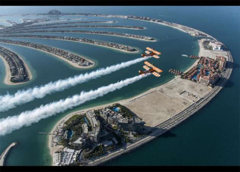 Galerinin tamamı için tıklayınızİngiliz Breitling takımından Danielle Hughes ve Emily Guilding, 2014 UIM Skydive Dubai XCAT Dünya Motoryat Serisi kapsamında yapacakları kanat üstünde yürüme gösterisi öncesinde Palm Cumeyra üzerinde prova yapıyor.