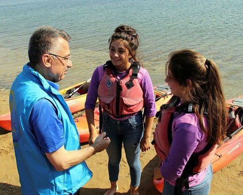 Galerinin tamamı için tıklayınızKampın girişinde çiçeklerle karşılanan Oktay, gençlerle yaklaşık bir kilometre bisiklet sürüşü yaptıktan sonra Macera İstasyonu'na geçti