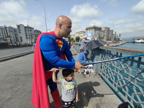 Galata'da bir garip olay... Süpermen kostümüyle balık tutmaya gitti görenler şok oldu!