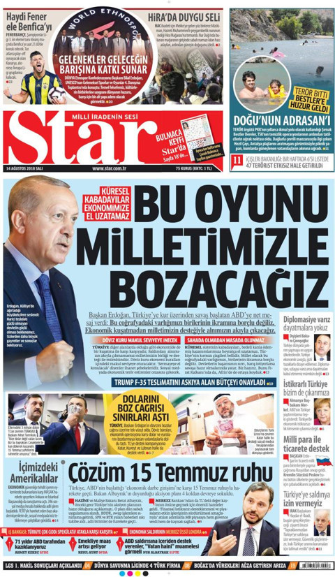 Gazete manşetleri 14 Ağustos 2018 Star - Sözcü - Yeni Şafak - Milliyet