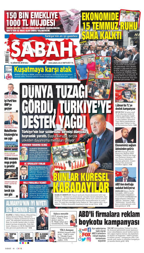 Gazete manşetleri 14 Ağustos 2018 Star - Sözcü - Yeni Şafak - Milliyet