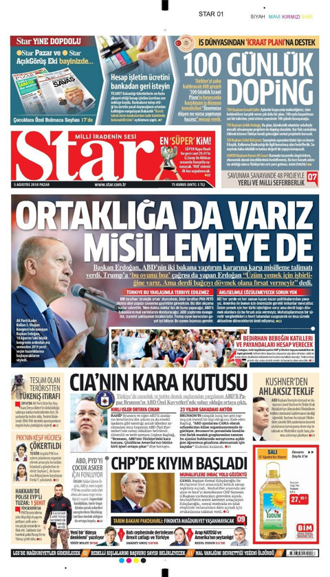5 Ağustos 2018 Pazar gazete manşetleri çıktı. “Bugünkü gazete manşetlerinde neler var? Gazeteler Türkiye ve dünya gündemine ilişkin bugün hangi manşetleri attı? Bugün Hürriyet Gazetesi, Sözcü Gazetesi, Sabah ve Habertürk gazetesi manşetlerinde neler var sizler için derledik. 5 Ağustos 2018 Pazar günü Milliyet, Hürriyet, Habertürk, Vatan, Türkiye, Takvim, Star, Sözcü, Sabah, Posta, Dünya, Cumhuriyet, Aydınlık, Akşam, Yeni Akit, Yenibirlik, Yeni Şafak, AMK, Fotomaç, Fanatik manşetleri galerinin devamında sizi bekliyor. İşte 5 Ağustos 2018 Pazar gazete manşetleri... 5 Ağustos 2018 Pazar gazete manşetleri çıktı. “Bugünkü gazete manşetlerinde neler var? Gazeteler Türkiye ve dünya gündemine ilişkin bugün hangi manşetleri attı? Bugün Hürriyet Gazetesi, Sözcü Gazetesi, Sabah ve Habertürk gazetesi manşetlerinde neler var sizler için derledik. 5 Ağustos 2018 Pazar günü Milliyet, Hürriyet, Habertürk, Vatan, Türkiye, Takvim, Star, Sözcü, Sabah, Posta, Dünya, Cumhuriyet, Aydınlık, Akşam, Yeni Akit, Yenibirlik, Yeni Şafak, AMK, Fotomaç, Fanatik manşetleri galerinin devamında sizi bekliyor. İşte 5 Ağustos 2018 Pazar gazete manşetleri...