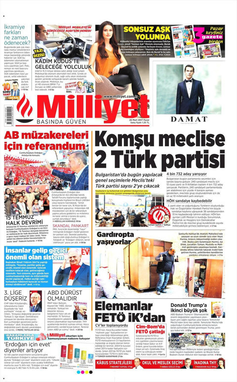 26 Mart 2017 Pazar gününün gazete manşetleri çıktı. Bugünkü Hürriyet Gazetesi, Sözcü Gazetesi, Sabah ve Habertürk gazetesi manşetlerinde neler var sizler için derledik. Hürriyet Gazetesi manşeti ile başlayalım. Hürriyet Gazetesi 26 Mart manşetini 'İnanılmaz fedakarlık' başlığıyla attı. Star Gazetesi ise manşetine 'Türk babayı yıkan soru' yazdı. HaberTürk Gazetesi manşetini 'Saygısızlık' başlığıyla, Ömer Halis Demir'e ayırdı. Milliyet bugünkü manşetine 'Komşu meclisa 2 Türk partisi' başlığını aldı. Sabah Gazetesi 'Oyunlar bozulacak Türkiye kazanacak' manşeti ile çıkarken, Akşam 'MİT çiftliği izliyor' haberini öne aldı. Vatan gazetesi annesi erkek çıkan genç kızı 'Kabus gibi' başlığıyla manşetine taşıdı. Sözcü Gazetesi'nin bugünkü manşetinde ise 'FETÖ'cü memur, polis, davulcu, zurnacı var! Ama vekil yokmuş' başlığıyla dikkat çekiyor. BirGün Gazetesi ile birlikte Fotomaç ve Fotospor gazetelerinin bugünkü manşetleri de şöyle;