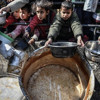 Gazze'nin güneyindeki Han Yunus şehrinin Mevasi bölgesinde yerlerinden edilen Filistinliler, boş kaplarıyla "Saade" adlı aşevinin önünde kuyruklar oluşturarak öğün almaya çalışıyor.