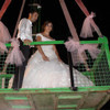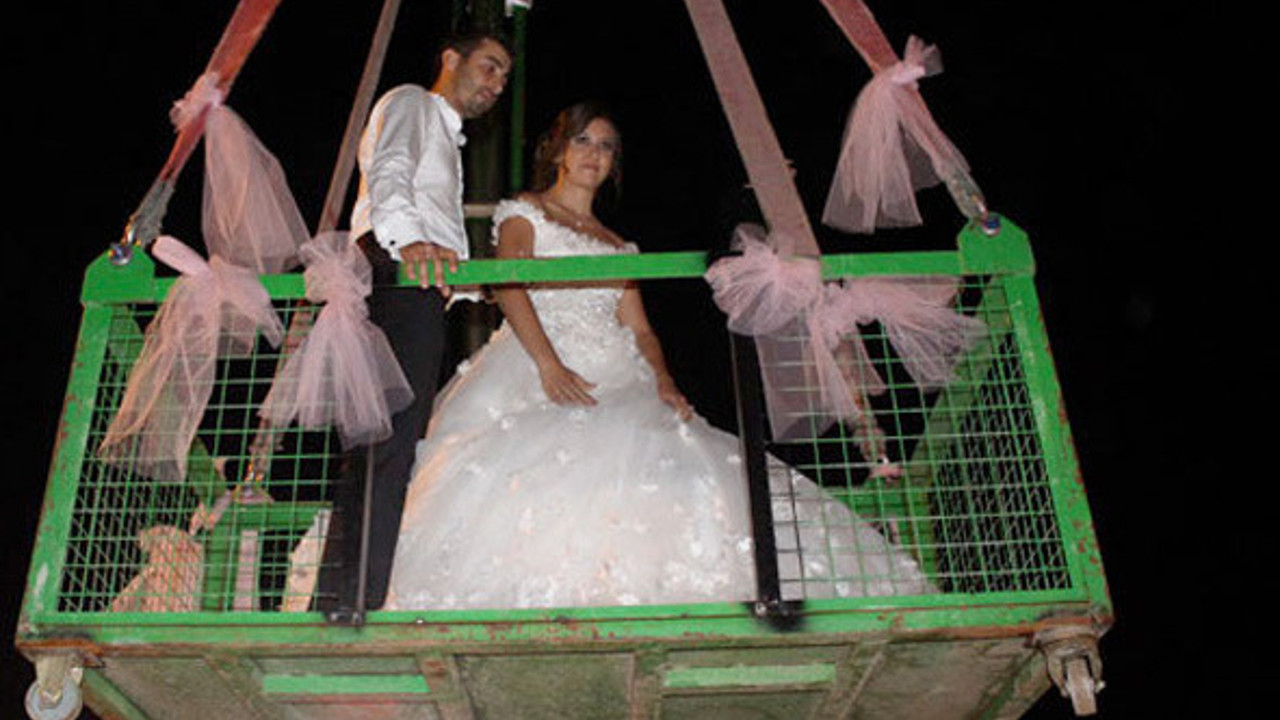 Aydın'ın Nazilli ilçesinde düğünden sonra yeni aldıkları eve gelen gelin ve damat, unutamayacakları kötü bir sürprizle karşılaştı. Nazilli'de dün akşam görkemli bir düğünle hayatlarını birleştiren Murat ve Ekin Şengün çifti, gece yeni aldıkları eve girmek istediler. Yapımı yeni tamamlanan apartmanın asansörü çalışmadığı için inşaat firmasının müdürü İbrahim Delen, gelinle damadın 7. kattaki evlerine yürüyerek çıkmalarına mani oldu. Çareyi vinç kiralamakta bulan firma müdürü, gelin ve damadı apartman önünde bekledi. Düğün bitiminde apartmanın önüne gelen damat Murat Şengün, gördüğü manzara karşısında şoke oldu. Önce şaka yapıldığını düşünen Şengün, gerçek olduğunu anlayınca firma sahibini vinç fikrinden vazgeçirmeyi denedi. Şirket müdürü ısrarcı olunca damat önce vinç önünde geline kahve yaptı, sonra akrabalarına tavada yumurta pişirdi. Daha sonra vincin sepetine binen gelin ve damat, sorunsuz bir şekilde 7. kattaki evlerinin balkonuna indi. Gelin arabasından iner inmez karşısında dev vinci gören damat Murat Şengün, şunları söyledi: "Bu organizasyonu ben ayarlamadım. Kimin başının altından çıktı onu da bilmiyorum. Ama söylediler, ilk başta inanmadım. Şuan ben de şoktayım, bir şey diyemiyorum. Yükseklik korkum yok ama bu halde olmaz yani. Ciddiler mi binmemiz konusunda ben çözemedim." Arabanın içerisinde dakikalarca bekleyen gelin Ekin Şengün ise, "Vinçten korkmuyorum şuan. Artık başımıza geldi, çekeceğiz" şeklinde konuştu. Daireyi genç çifte satan inşaat firmasının müdürü İbrahim Delen, "Biz sizin rahatınız için vinç çağırdık. Asansör bozuk olduğu için mecbur kaldık. Bu bizim şirketimizin size ikramı. Damat evi bizim şirketten aldı, aynı zamanda komşumuz. Fakat düğün günü asansörümüz teknik bir arıza verdi, yapamadık. Onun için böyle bir hizmeti sunmak zorunda kaldık" dedi.