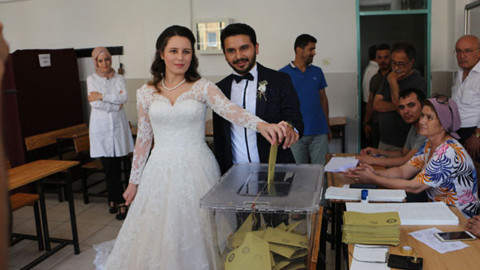 ANTALYA’nın Alanya ilçesinde düğün günleri seçim günüyle çakışan Alanya Belediyesinde memur olarak görev yapan 26 yaşındaki Büşra Masatlı ile 27 yaşındaki Ali Gök, oylarını kullanmak için gelin arabasıyla Alanya Fevzi Alaettinoğlu Lisesine geldi. Gelinlik ve damatlıklarıyla sandık görevlilerine kayıt yaptıran çift, 1154 numaralı sandıkta oylarını kullandı. Gelin Büşra Masatlı, “Seçimlerimiz tüm Türkiye’ye hayırlı olsun. Düğün günümüze denk gelmesi bizim için hoş bir anı oldu. Umuyoruz ki bu günümüz gibi her günümüz düğün havasında geçer” diyerek oyunu sandığa attı. Oylarını kullanan çift, ‘Aşk ittifakı’ yazan gelin arabalarına binerek düğün salonuna gitti.