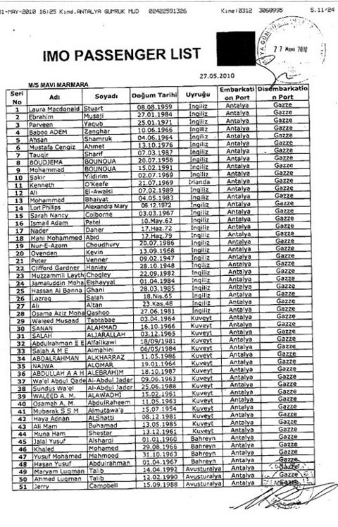 Gazze'ye insani yardım götüren konvoydaki en önemli gemi Mavi Marmara idi. İşte o gemide bulunan yolcuların tam listesi...