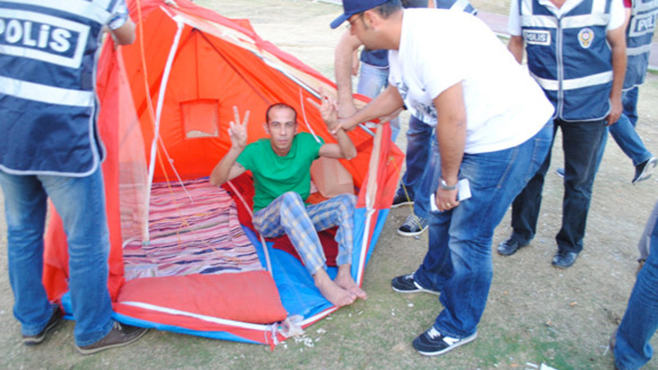 Taksim Gezi Parkı'nda yaşanan protestolara destek vermek amacıyla İzmir'deki eylemlerini çadırlarda sürdüren eylemcilere polis operasyon düzenledi. Taksim Gezi Parkı'nda yaşanan protestolara destek vermek amacıyla İzmir'deki eylemlerini Gündoğdu Meydanı ve 1. Kordon'da kurdukları çadırlarda sürdüren eylemcilere operasyon düzenlendi. Polis ekipleri, eylemcilere çadırlarını kaldırmaları konusunda defalarca uyarıda bulundu. Eylemcilerin çadırları kaldırmayarak polise direnmeleri üzerine polis ekipleri eylemcilerden 34’ünü gözaltına aldı. Meydanda ve 1. Kordon’da bulunan çadırlar yerlerinden söküldü. İzmir Valisi Mustafa Toprak, dün eylemci gruplar arasından seçilen 8 kişilik heyeti kabul etmiş, çadır eyleminin turizm ve ticareti olumsuz etkilediğini belirterek çadırların kaldırılmasını istemişti. Grup üyeleri ise görüşmenin ardından Gündoğdu Meydanı’nda basın açıklaması yaparak cumartesi gününe kadar çadırları kaldırmayacaklarını açıklamıştı. Bu gelişmelerin ardından 17 gündür Gündoğdu Meydanı ve 1.Kordon’da kurdukları çadırlarda kalan eylemcilere yönelik sabah saatlerinde operasyon düzenlendi. Çevik Kuvvet polisi desteğinde harekete geçen polis ekipleri, çadırların bulunduğu alana geldi. Polisin geldiğini fark ederek bir araya toplanan eylemciler ise polise engel olmak için tek sıra halinde dizildi. İzmir Emniyet Müdür Yardımcısı, eylemcilerin temsilcilerine, çadırları kendilerinin kaldırmasını istedi. Eylemci temsilcileri ise çadırları kaldırmayacaklarını belirtti. Çağrılara olumsuz yanıt gelmesi üzerine polisler harekete geçti. Polisle eylemciler arasında çıkan arbedede 34 eylemci gözaltına alındı. Polis ekipleri, alanda bulunan çok sayıda çadırı yerinden sökerek kamyona yükledi. Operasyon sürerken bir grup ise halka oluşturarak gitar ve bağlama eşliğinde şarkılar söyledi.
