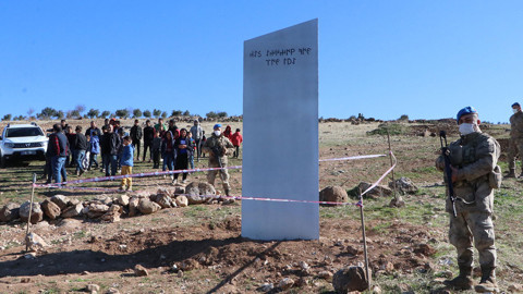 ŞANLIURFA'da Göbeklitepe yakınlarında araziye yerleştirilmiş üzerinde Göktürk alfabesiyle, 'Gökyüzüne bak ayı gör' yazılı metal bloğun sırrı henüz çözülemedi. Kim ya da kimler tarafından araziye dikildiği araştırılan metal bloğun bulunduğu alanda jandarmanın nöbeti ise sürüyor.