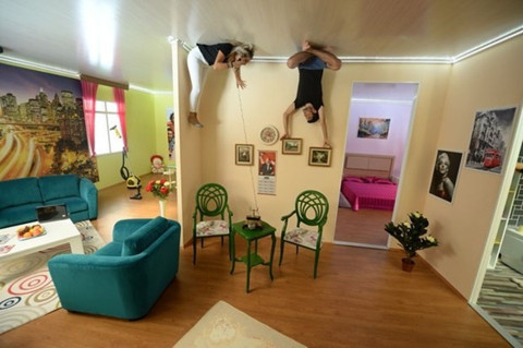 Galerinin tamamı için tıklayınızTÜRKİYE'DE BİR İLK Kaan Karahan, evin Türkiye'de ilk, dünyada da 13'üncü ters ev olduğunu söyledi. Evi "Antalya'da her şey var ama ters ev yok" düşüncesiyle yaptıklarını anlatan Karahan, "Evdeki 25 derecelik açı ilk girişte ziyaretçilerimizde baş dönmesi yapıyor.