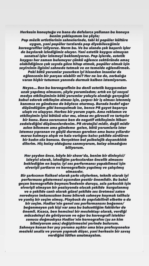 Gülçin Ergül, Hadise'nin Harbiye konserindeki koreografiyi ve sosyal medyadaki tepkileri değerlendirdi; "Eğer amaç konuşulmaksa, bu anlamda PR stratejisi başarılı oldu diyebilirim"Akçıl, Van konseri öncesi şu paylaşımı yaptı: SİNAN AKÇIL'DA YORUM YAPMIŞTI Sinan Akçıl Hadise'ye gönderme yaptı. "Sahnede erotik dansım yok, transparan erkek popçu gömleğim de yok. Ama bir bakın bakalım Çarşamba günü Van'da neler olacak ya da Cumartesi Ordu/Ünye'de... İlk kez gittiğim şehirlerde bunlar olmadan da seyirci rekorlarını kırmaya devam ediyorum. Allah'a şükürler olsun. Beni idare edin."'Hepsi' grubunun eski solisti Gülçin Ergül de sosyal medya hesabından yaptığı uzun açıklamayla hem koreografinin içeriğini hem de toplumsal yansımalarını değerlendirdi.GÜLÇİN ERGÜL'DEN UZUN BİR ELEŞTİRİ GELDİ Gülçin Ergül açıklamasında şu ifadelere yer verdi: Herkesin konuştuğu ve bana da defalarca yollanan bu konuya benim yaklaşımım şöyle; pop müzik artistlerinin sahnelerinde, tabii ki popüler kültüre uygun, yani 'Pop' diyebileceğimiz tarzlarda koreografiler izliyoruz. Bu bir norm. Ve bu alanda çok başarılı, bayılarak izlediğimiz işler de oluyor. Yani sanatsal bir derinlik değil, estetik kaygının ön planda olduğu, geniş kitlelere hitap eden eğlenceli işler bekliyoruz. Popüler işlerde estetik kaygı her zaman vardır çünkü eğlence sektöründe amaç, mümkün olduğunca çok sayıda izleyiciye ulaşmak, ilgiyi sahnede tutmak ve en temelde izleyiciyi eğlendirmektir.Peki, kötü yorumlar yazarken iyi hisseden insanlar da bu eğlencenin bir parçası olabilir mi? Her neyse de, zorbalığa varan hiçbir tutumun yanında durmayı kalben istemiyorum. Bu koreografinin estetikten uzak oluşunu ise şöyle yorumluyorum: Artık sosyal medya etkileşimlerinin büyük bir kısmı olumsuz yorumlarla sağlanıyor ve bu durum bilinerek sahneye çarpıcı bir iş konulmuş olabilir. Böylece gündem olundu. Eğer amaç konuşulmaksa, bu anlamda PR stratejisi başarılı oldu diyebilirim. Ama reklamın ve etkileşimin iyisi kötüsü olur mu, bu tartışılır. Bana sorarsanız, negatif etkileşim uzun vadede itibar zedeler."SAHNE PLANLAMASI TALİHSİZ BİR SEÇİM OLMUŞ" PR stratejisi midir, değil midir bilemem ama gündeme gelen, olumsuz yorumlarla yıpranan ve güçlü durması gereken bir kadın söz konusu. Üstelik bu kadın, buna yıllardır maruz kalmasına rağmen hâlâ sahnede kalabilmiş biri. Bu hiç kolay değil, ciddi bir psikolojik dayanıklılık gerektiriyor. Benim bir izleyici olarak beklentim ise şarkıcının ses performansını en iyi şekilde sergileyebilmesi için sahne düzenlemesinin ve koreografinin bu amaca uygun şekilde yapılmış olması. Şarkı söylerken beden duruşu yani postür, ses performansını doğrudan etkiler. Bu koreografide ise duruş, şarkıcılık açısından uygun olmayan bir pozisyondaydı. Bu da teknik olarak iyi bir performansı zaten baştan imkânsız kılıyor ve bu nedenle sahne planlaması talihsiz bir seçim olmuş. Playback elbette tercih edilebilirdi; o da bir seçimdi. Hadise’nin genel ses performansını beğenen de beğenmeyen de var. Ancak teknik koşullar göz önünde bulundurulduğunda bu tür detaylar da önem taşıyor. Ben bir hemcinsi ve meslektaşı olarak onun verdiği mücadeleyi görüyorum ve bu koreografi eğer kendi tercihi değilse, koreografının değişmesini yerinde bulurum. Sahneye konan her şey yoruma açıktır ama bize düşen, profesyonelce ve yapıcı analizler yapmaktır. Unutmayalım ki herkesin bir savaş verdiği bu dünyada, biraz daha empati ve anlayışla yaklaşmak çok şey değiştirir."