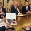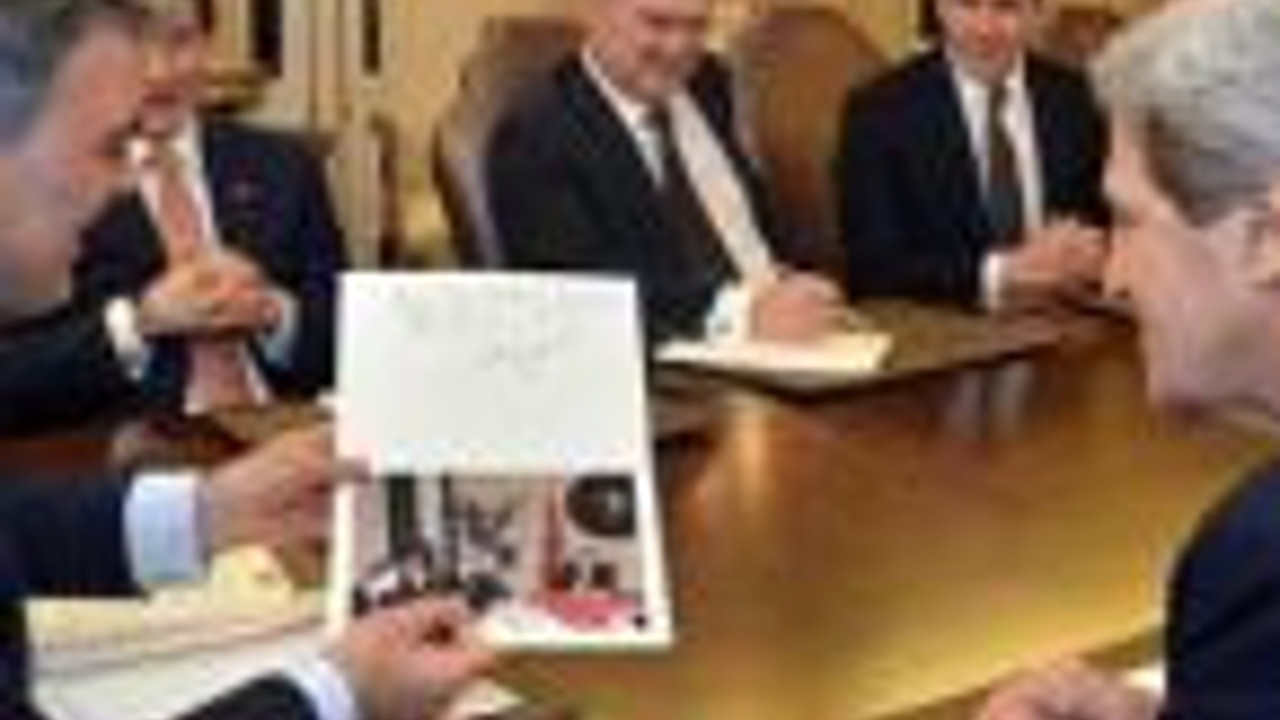 Cumhurbaşkanı Gül, ABD Dışişleri Bakanı Kerry'yi kabul etti Gül, Kerry'ye, 2008 yılında senatörken kendisini ziyareti sırasında çekilen fotoğrafı hediye etti Fotoğrafta Kerry'nin yanı sıra şimdi ABD Başkan Yardımcısı olan Biden ve Savunma Bakanı olan Hagel da yer alıyor Kerry, ''Bu, çok güzel. Bize hitaben bir şeyler yazar mısınız? 'En önemli üç adam' diye yazar mısınız?'' dedi. Cumhurbaşkanı Gül de ''Başkan Obama yönetiminin en önemli üç adamı benimle birlikte'' yazarak fotoğrafı imzaladı ve Kerry'ye verdi. Teşekkür eden Kerry, ''O günkü toplantıyı hatırlıyorum. Afganistan'dan buraya gelmiştim'' diye konuştu.