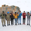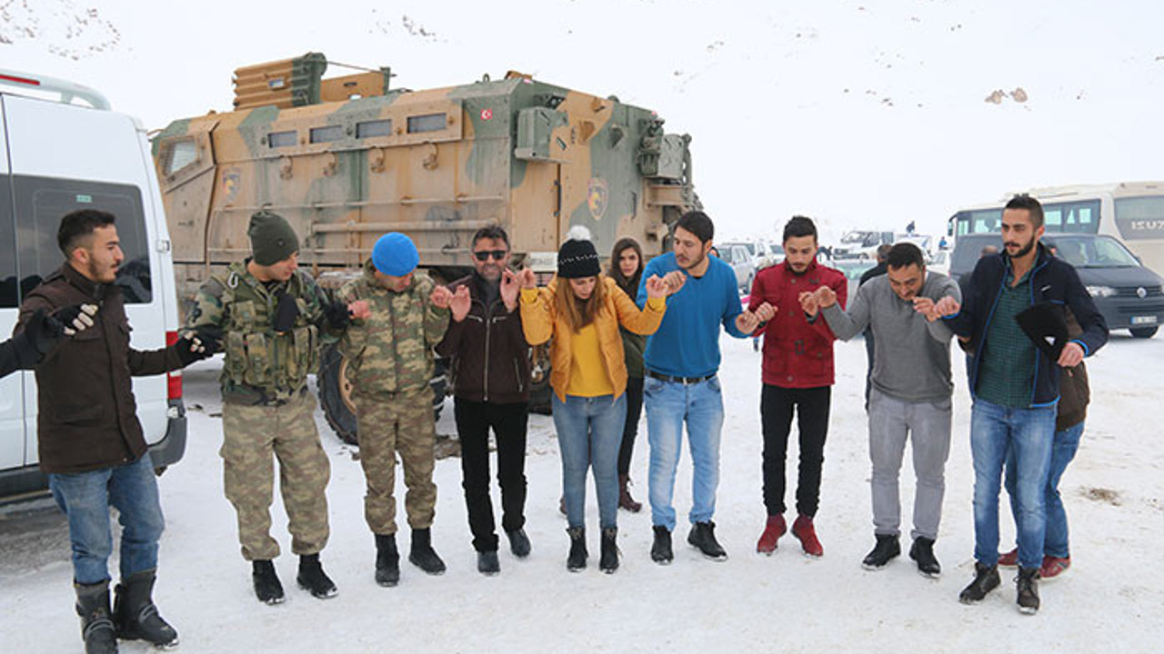 Hakkari'de kayak merkezine giden vatandaşlar kar trafiğine takılınca bölgede nöbet tutan askerlerle halay çekti. Terör örgütüne yönelik operasyonların ardından huzur ve güven ortamının sağlandığı Hakkari'de vatandaşlar, kar yağışını fırsat bilerek kente 12 kilometre uzaklıktaki Merga Bütan Kayak Merkezi'ne akın ediyor. Hafta sonu tatilininin yanı sıra hafta içinde de güzel vakit geçirmek isteyenlerin yoğun ilgi gösterdiği kayak merkezinde, İl Jandarma Komutanlığı ekipleri de vatandaşların güvenliği için sürekli nöbet tutuyor. Piknik amacıyla merkeze gelen vatandaşlar, araçlarında açtıkları müzik eşliğinde güvenliklerini sağlayan askerlerle kol kola girerek halay çekti. Renkli görüntülerin yaşandığı merkezde, askerlerlerle birlikte eğlenceli zaman geçiren vatandaşlar, birlik ve beraberlik mesajları verdi. Yıllardır özlemini çektikleri tabloyu yeniden yaşadıkları için mutlu olduklarını ifade eden vatandaşlar, huzur ortamının aynı kararlılıkla devam etmesini diledi.