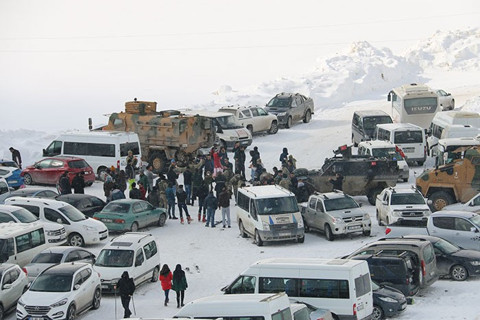 Hakkari'de kayak merkezine giden vatandaşlar kar trafiğine takılınca bölgede nöbet tutan askerlerle halay çekti.