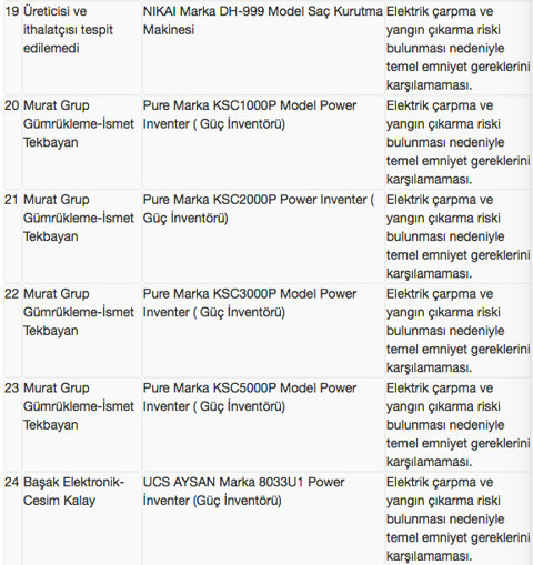 Sanayi ve Teknoloji Bakanlığınca, haksız rekabetin önüne geçilmesi için can, mal ve çevre güvenliği açısından tehlike oluşturan ağırlıklı ithal ürünlere yönelik sıkı denetimler sonucu güvensizliği tespit edilen 29 ürüne ilişkin toplatma kararı alındı. Bunların yüzde 72'sini ithal ürünler oluşturdu. Toplatılacak ürünler arasında elektrik motoru, su ısıtıcısı, ağda makinesi, priz, yangın söndürme cihazı, emniyet kemeri, LED lamba, saç kurutma makinesi, güç inventörü, LED'li yılbaşı ışığı ve porselen duyulu askı takımı gibi eşyalar yer aldı. Güvensizliği tespit edilen ve toplatma kararı alınan ürünlerin listesi şöyle: