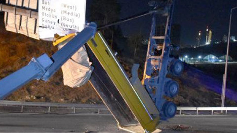 BAŞAKŞEHİR'de seyir halindeyken damperi açılan hafriyat kamyonu Trafik uyarı levhalarının bulunduğu direğe çarptı. Çarpmanın etkisiyle kamyonun kasası asılı kalırken sürücü kamyonun kupasıyla kaçarak kayıplara karıştı. Olay saat 00.50 sıralarında TEM otoyolu Başakşehir Mevkii Olimpiyat Stadı'na giden yan yolda meydana geldi. Damperi açık unutulan kamyon, trafik uyarı levhalarının bulunduğu direğe çarptı. Çarpmanın etkisiyle kasa kamyondan koparak direkte asılı kaldı. Plakası henüz tespit edilemeyen sürücü kamyonun kupasıyla kaçarak kayıplara karıştı. Uyarı levhalarının bulunduğu demir blokla asfalt arasına sıkışan kamyonun kasası şaha kalktı. Kaza nedeniyle Olimpiyat Stadı yolu çift yönlü olarak trafİğe kapatıldı. Olay yerine çok sayıda itfaiye ekipleri sevk edildi. Uzun süren çalışmanın ardından kamyonun kasası vinç yardımı ile asılı olduğu yerden kurtarıldı.