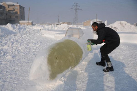 Galerinin tamamı için tıklayınızHAKKARİ'nin Yüksekova ilçesinde günlerdir etkili olan kar yağışı ile birlikte kar kalınlığı 1 metreyi bulurken hava sıcaklığının eksi 20'lere kadar düştüğü ilçenin Yeni Mahallesinde yaşayan ve inşaat işçiliği ile çobanlık yaparak geçimini sağlayan Mehmet Şerif Karahan, kardan 15 metre uzunluğunda 7 metre genişliğinde F-35 savaş uçağı yaptı.