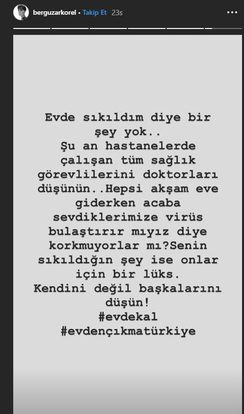 Galerinin tamamı için tıklayınızİşte Korel’in o paylaşımı: "Evde sıkıldım diye bir şey yok... Şu an hastanelerde çalışan tüm sağlık görevlilerini doktorları düşünün.. Hepsi akşam eve giderken acaba sevdiklerimize virüs bulaştırır mıyız diye korkmuyorlar mı? Senin sıkıldığın şey ise onlar için bir lüks. Kendini değil, başkalarını düşün!" ifadelerini kullandı.