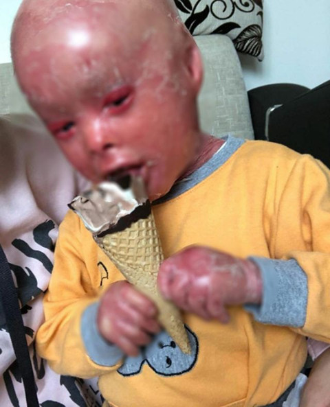 Galerinin tamamı için tıklayınızEmir'in göz ve kulaklarının da aynı şekilde takip edildiğini belirten Aydın Özerdoğan, göz kapakları olmadığı için gözlerini kapatamadığını, sürekli açık kaldığından gözlerde lekelenmeler oluştuğunu, suni gözyaşı ve jel kullandıklarını söyledi. Gözlerini kapatamadığından uyurken de Emir'in gözlerinin açık olduğunu anlatan Özerdoğan, "Uyurken gözleri açık kaldığından bolca jel sürüp, dış etkenlerden de korumak için göz bandıyla kapatıyoruz. O şekilde uyuyabiliyor" dedi.