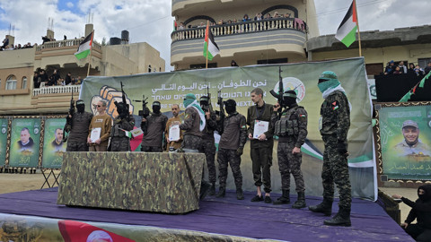Hamas'ın silahlı kanadı İzzeddin el-Kassam Tugayları, takas anlaşmasının beşinci turunda İsrailli esirlerin teslim edileceği platformun üzerine "Biz tufanız. Savaşın ertesi günü biziz." yazılı büyük bir pankart astı.