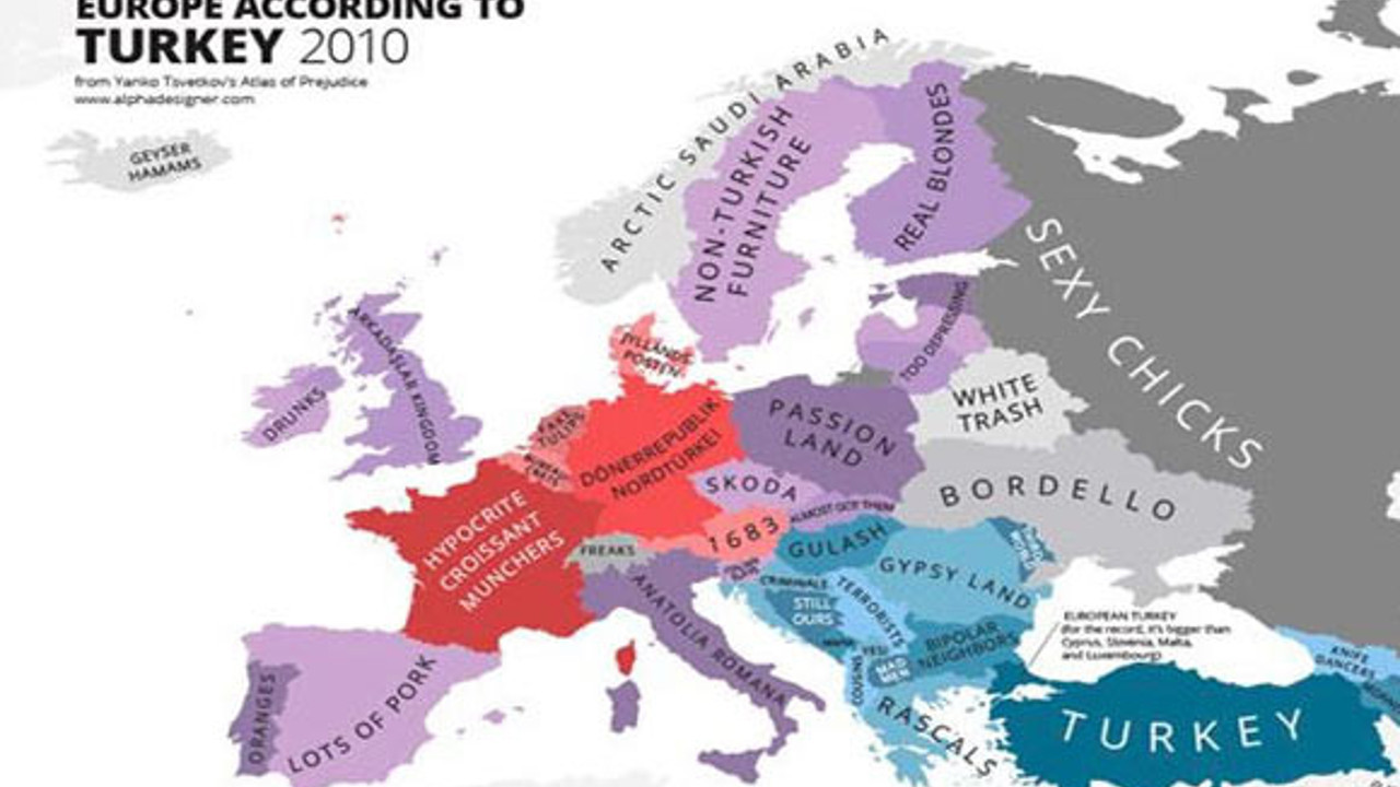 Alpha Design'ın ülkelere göre haritalar serisini çoğu kişi görmüştür. Bu haritalara zamanla yenileri eklendi... Türkiye hakkında hangi ülke ne düşünüyor bir göz atalım. 2012'de Avusturya'ya göre Türkiye: Fast food Büyük Britanya'ya göre Türkiye: Domuz yağı içermeyen yemekler ülkesi Bulgaristan'a göre 2009'da Türkiye: Kapalıçarşı Fransa'ya göre 2009'da Türkiye: Kesinlikle Avrupalı olmayan ülke Almanya'ya göre 2010'da Türkiye: İş gücü kaynağı Yunanistan'a göre 2011'de Türkiye: Doğu Yunanistan (Türklere ödünç verildi) İtalyanlara göre 2009'da Türkiye: Göbek dansının anavatanı Polonyalılara göre 2010'da Türkiye: Minare Ruslara göre 2010'da Türkiye: Turist kolonisi İspanyollara göre 2011'de Türkiye: Doğu Fas Lüksemburglulara göre 2013'te Türkiye: Asya ülkesi Avusturya - Macaristan İmparatorluğu'na göre 1914'te Osmanlı: Zombi imparatorluğu Avrupa'ya göre 2009'da Türkiye: YouTube'suz ülke Geylere göre 2010'da Türkiye: Seksi ama homofobik adamlar Latin Amerikalılara göre 2012'de Türkiye: Shakira'nın dansını yaptığı ülke Arap Baharı 2011'e göre Türkiye: Hakem Arap Baharı 2012'ye göre Türkiye: Başörtülü demokrasi