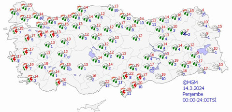 Yağışların Çanakkale, Tekirdağ, Edirne, Muğla ve Edremit Körfezi çevreleri ile Aydın'ın kıyı kesimlerinde yer yer kuvvetli olması bekleniyor.14 Mart Perşembe15 Mart CumaMuğla'da kuvvetli sağanak bekleniyor Muğla'da kuvvetli ve gök gürültülü sağanak bekleniyor. . Kuvvetli yağışlarla birlikte sel, su baskını, yıldırım, yerel dolu, yağış anında kuvvetli rüzgar, kıyılarda hortum riski ve ulaşımda aksamalar gibi olumsuzluklara karşı dikkatli ve tedbirli olunması gerekiyor.Çanakkale Valiliği uyardı Çanakkale Valiliği'nden yapılan açıklamada, "İlimizde etkili olan kuvvetli sağanak yağış nedeni ile dere yataklarının debisinin arttıracağından dolayı olası taşkın riskine karşı vatandaşlarımızın can ve mal güvenliği açısından dere yataklarından uzak durması ve tedbirli olunması önemle rica olunur." ifadesi kullanıldı.5 günlük haritalı hava durumu tahmini 13 Mart Çarşamba16 Mart Cumartesi17 Mart Pazar