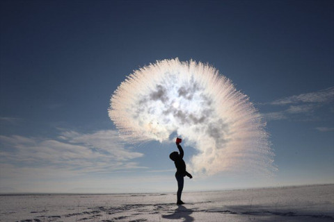 Hava sıcaklığının eksi 17 derece olduğu Kars'ta havaya serpilen kaynar su dondu!