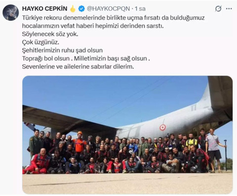 Galerinin tamamı için tıklayınız"Türkiye rekoru denemelerinde birlikte uçma fırsatı da bulduğumuz hocalarımızın vefat haberi hepimizi derinden sarstı. Söylenecek söz yok. Çok üzgünüz. Şehitlerimizin ruhu şad olsun. Toprağı bol olsun. Milletimizin başı sağ olsun. Sevenlerine ve ailelerine sabırlar dilerim."