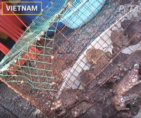 Galerinin tamamı için tıklayınızGörüntülerde, küçücük kafesler içindeki canlı hayvanların yanı sıra, derisi yüzülmüş köpekler, kazlar, tavuklar, balıklar, yarasalar ve maymunlar yer aldı.