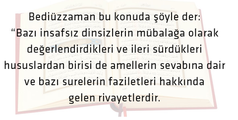 Bediüzzaman Said Nursi, "Kur'an-ı Kerim'deki surelerin sevabında mübalağa yok mudur?" sorusunu Yirmi Dördüncü Söz'de böyle cevaplıyor... Kaynak:STV